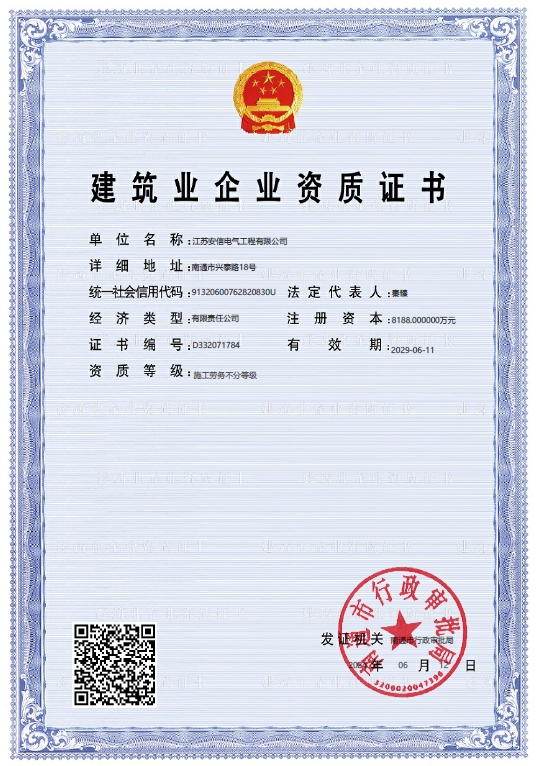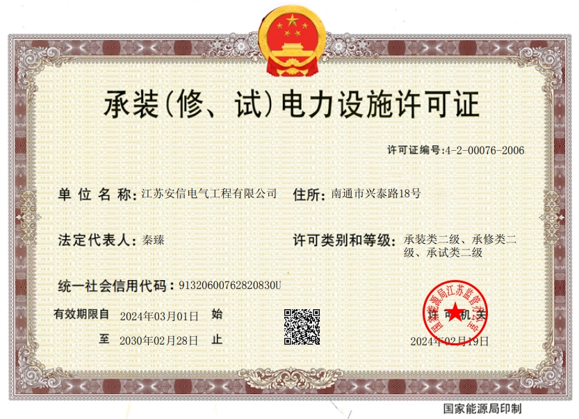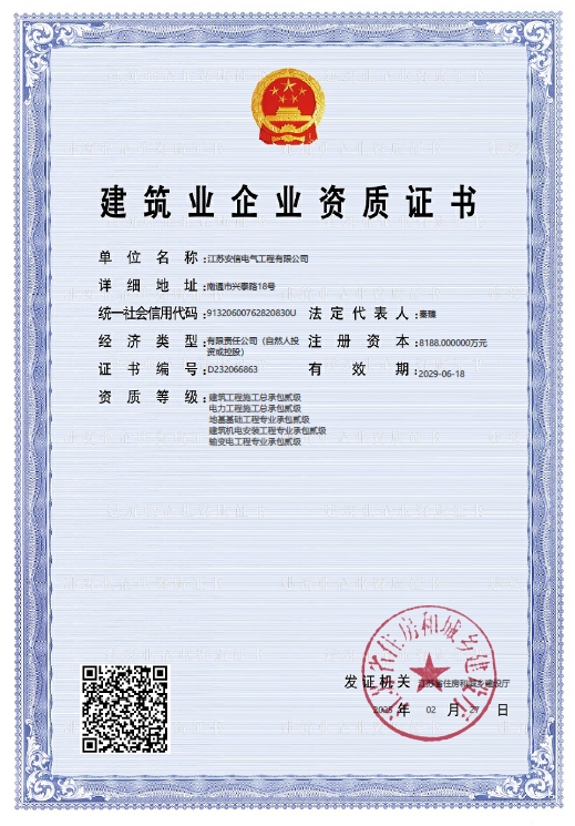 承裝二級、承修二級、承試二級,電力工程施工總承包二級,輸變電工程專業(yè)承包二級,建筑工程施工總承包二級,建筑機(jī)電安裝專業(yè)承包二級,地基基礎(chǔ)專業(yè)承包二級